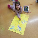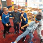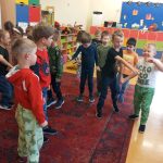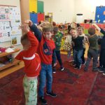 Tego dnia nasze ubrania wypełnione były kolorowymi kropkami. Na zajęciach uważnie wysłuchaliśmy opowiadania jak to zwyczajna kropka zmieniła świat małej dziewczynki o imieniu Vashti. Historia ta uświadomiła przedszkolakom, że każdy z nas ma jakieś ukryte zdolności, TALENT. Dostrzegaliśmy, że świat składa się z kropek małych i dużych. Kropki gościły w zabawach ruchowych jak i matematycznych.