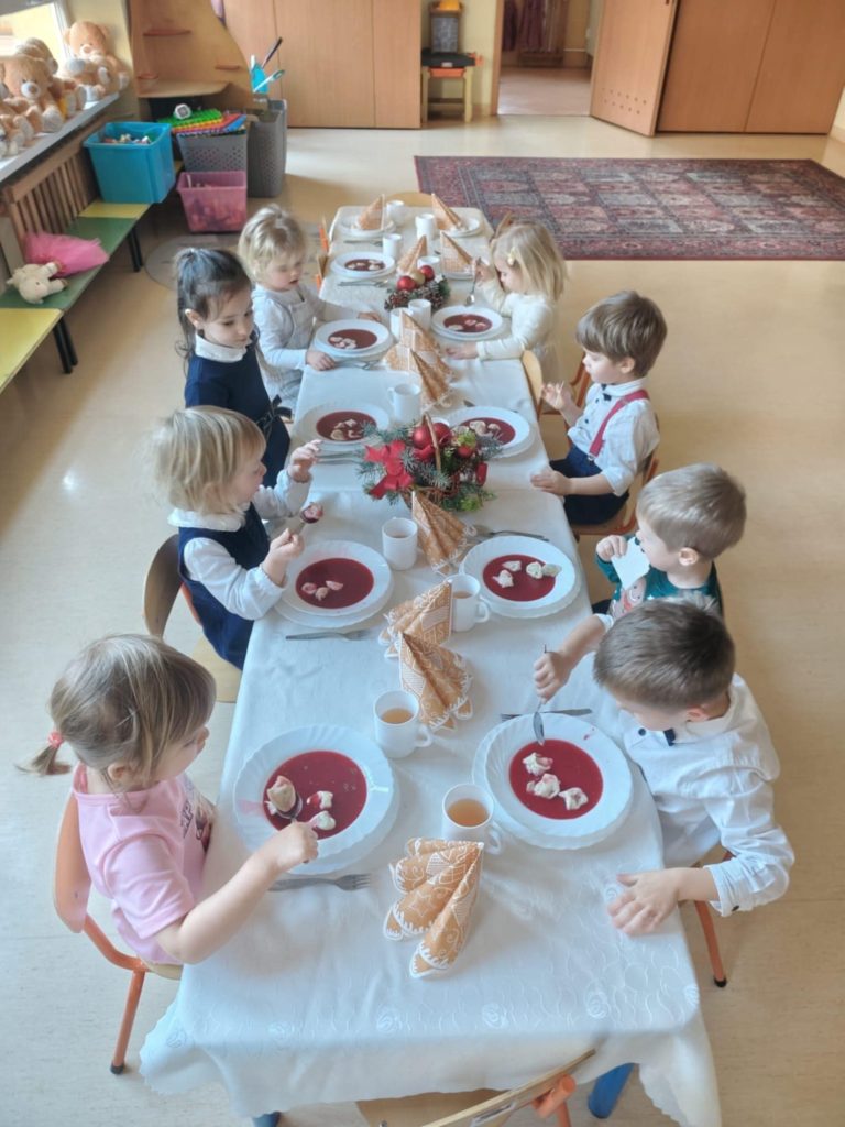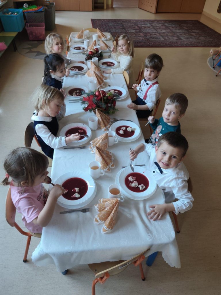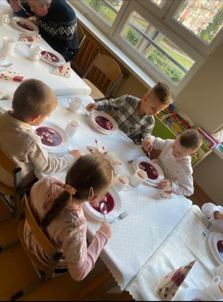 Spotkanie wigilijne 2021r., na ktrym pojawiły siętradycyjne potrawy jak barszczyk z uszkami czy ryba. W holu głwnym śpiewaliśmy kolędy oraz składaliśmy życzenia, a poniżej uchwycone chwile,
